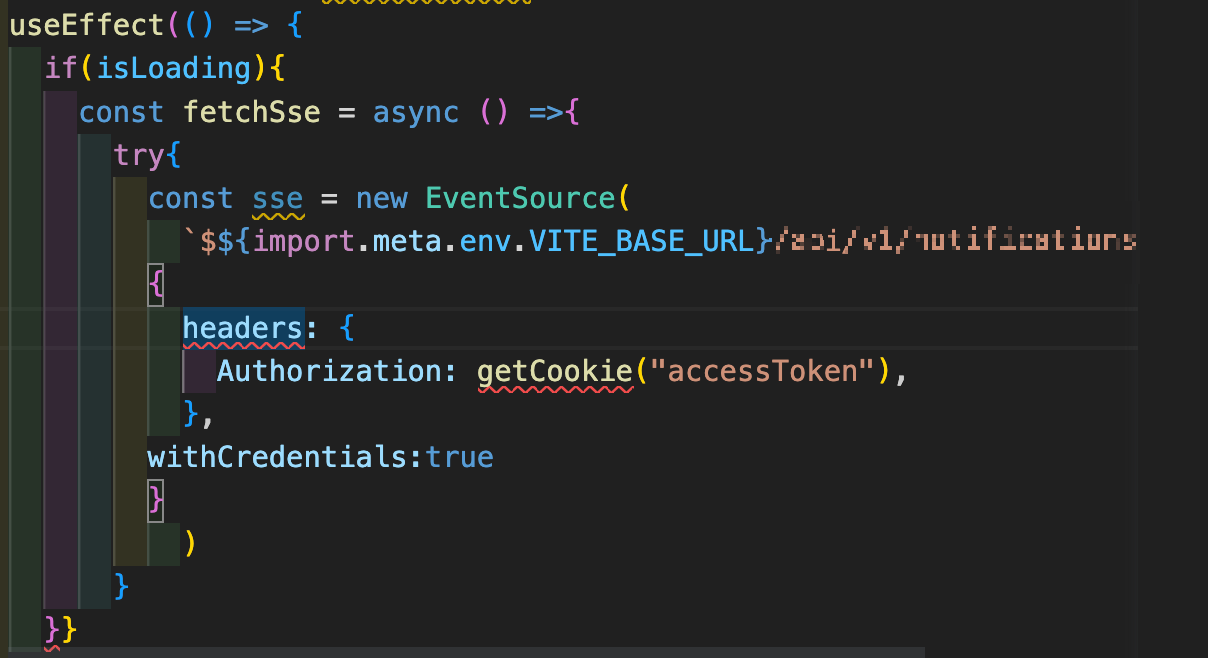 리액트로 SSE 구현 중에 엑세스 토큰을 header에 담아서 보내야하는데, EventSource에서 headers를 넣을 수 없다는 오류가 발생했다.