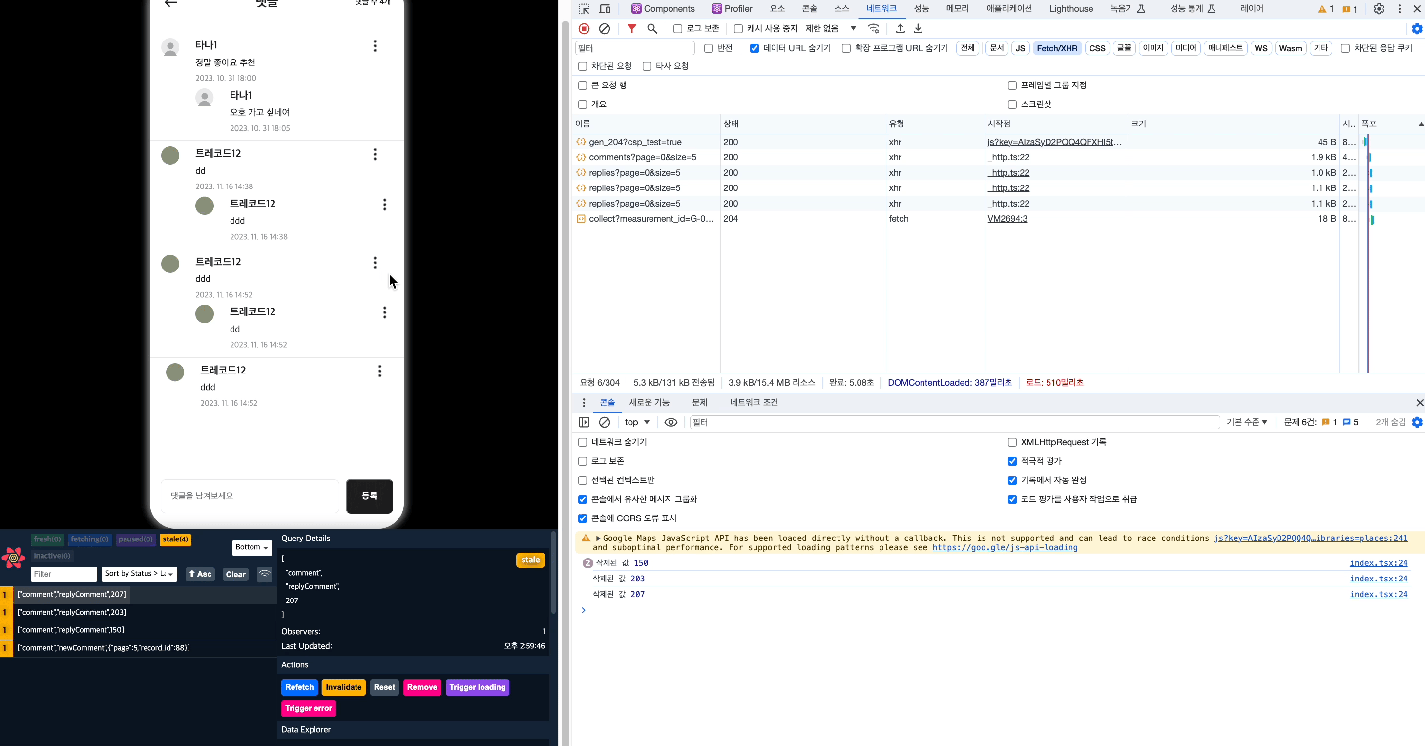 그래서 이 점을 해결하고자, 모든 replyComment 캐시를 삭제하고 다시 불러오는 식으로 구현을 해야겠다고 생각이 들어서 엑세스 가능한 쿼리를 제거할 때 사용하는 함수인 removeQueries를 이용더니, 오류없이 잘 작동하는 모습을 확인 할 수 있었다.