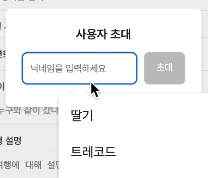 - 닉네임을 입력하고, 초대를 누르고 해당 닉네임이 있다면 닉네임이 나옵니다. 처음에 똑같은 닉네임을 검색했다면, 초대 버튼을 누르지 않아도 리스트에 닉네임이 표시되는 문제점이 발생하였습니다.