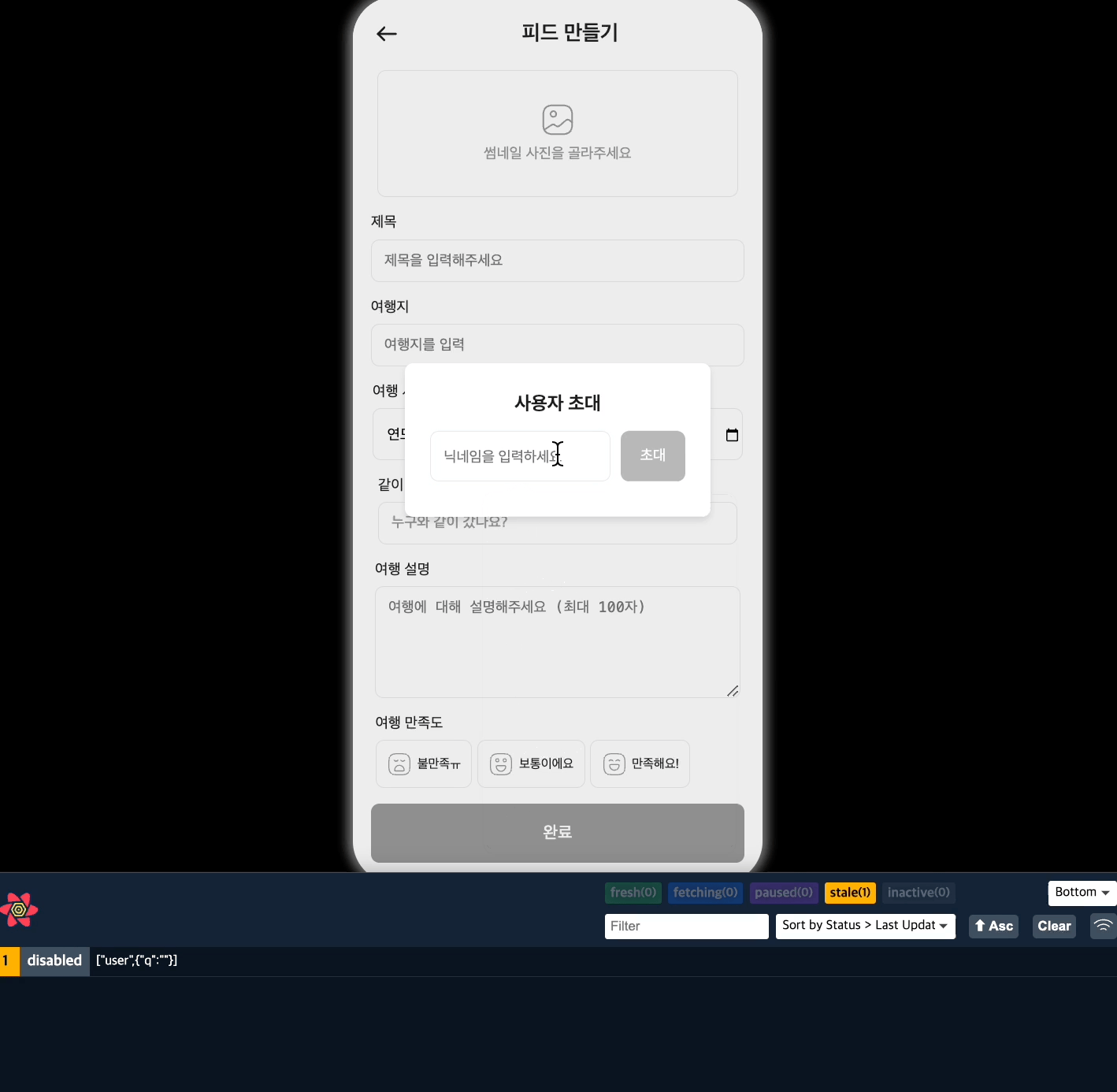 - 로직에서 enabled를 이용하여 초대 버튼을 클릭시 enabeld가 true가 되며, useEffect를 이용하여 데이터가 변경되면 enabled가 false가 되게 처리하였습니다. 하지만 useEffect를 제거하고 로직을 개선의 필요성을 느꼈습니다.