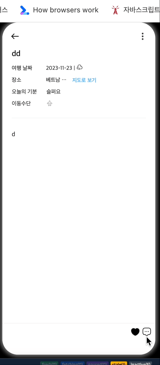 곰곰히 생각해보니, 상관없는 Cache된 데이터도 삭제해버리니, 정작 react-query의 이점을 제대로 못 적용하고 있다고 생각이 들었고, 다른 기록의 댓글을 클릭하니깐 약간 깜빡임처럼 기존의 댓글이 보이는 현상을 확인 할 수 있었다.