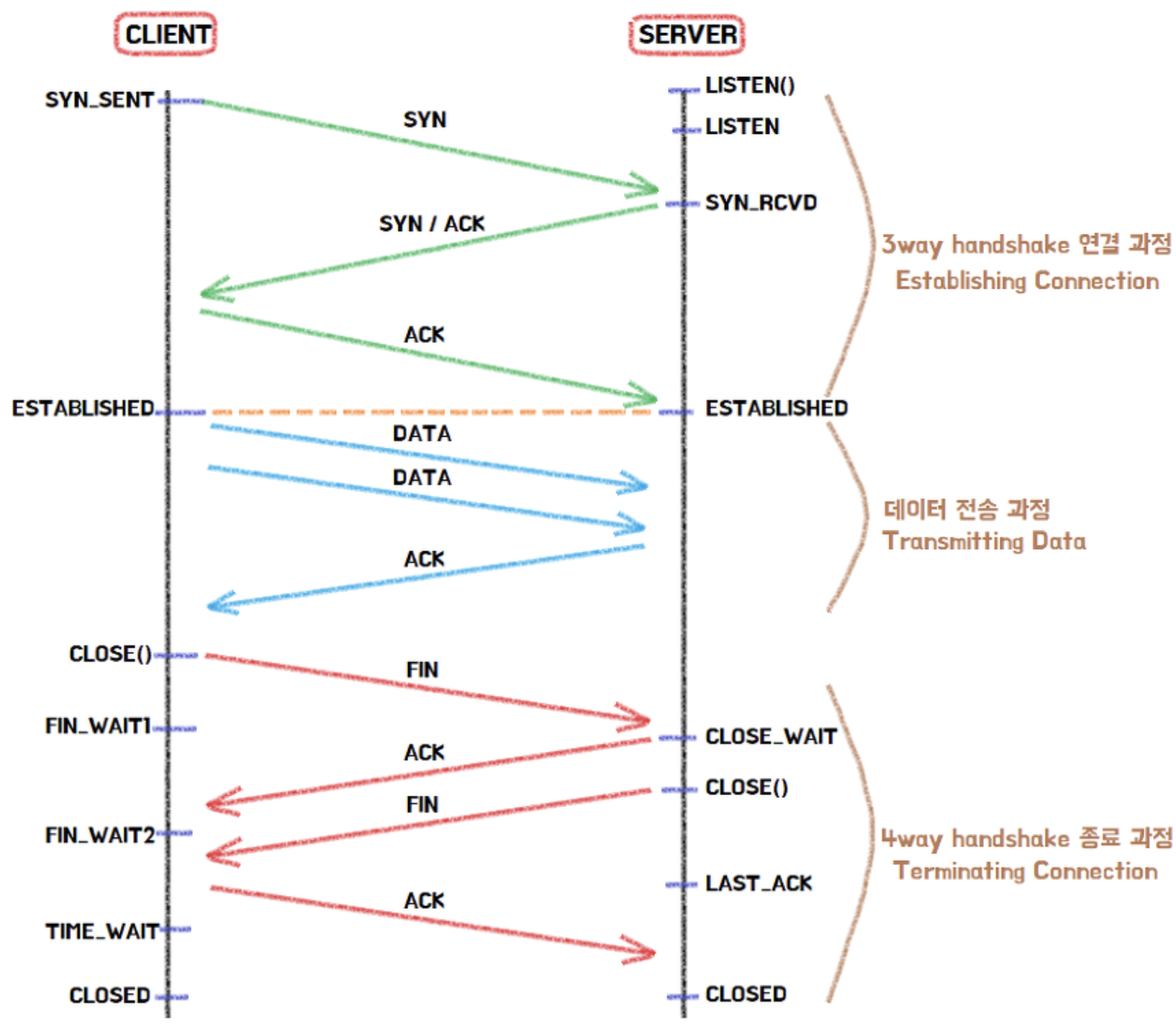 서버도 연결을 닫았다는 신호를 클라이언트가 수신하면 ACK 플래그를 보낸 후 TIME_WAIT 상태로 전환된다. 이 후 모든 것이 끝나면 CLOSED 상태로 변환된다.