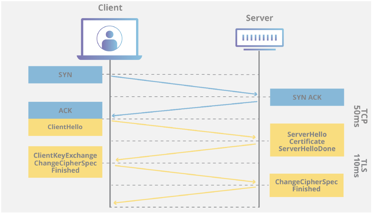 - TLS핸드 셰이크는 사용자가 HTTPS를 통해 웹 사이트를 탐색하고 브라우저가 처음 해당 웹 사이트의 원본 서버를 쿼리하기 시작할 때마다 발생합니다. (1.3이전 버전에서 RSA 키 교환 알고리즘을 사용했기에 이와 관련해서 단계 별로 설명하겠습니다.)