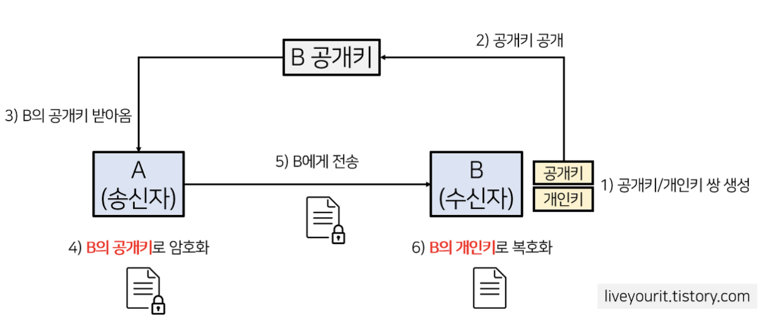 - A가 B의 공개키를 사용해 데이터를 암호화