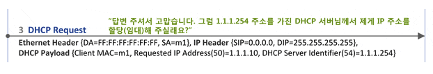 사용 가능한 IP주소가 맞는지 확인하고 해당 IP주소를 사용하겠다는의미로 DHCP Request메시지를 브로드캐스트합니다.