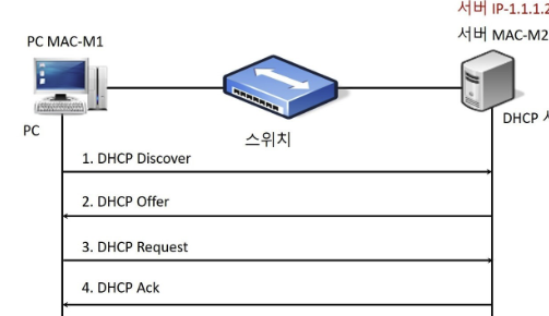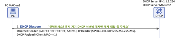 DHCP 서버에게 IP 주소 정보 요청하는 메시지를 보낸다(DHCP Discover메시지를 브로드캐스트)