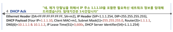해당 IP주소를 Client에게 할다아 DHCP 서버가 클라이언트에게 DHCP Acknowledgment메시지 보낸다.