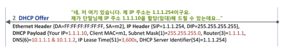 사용가능한 IP주소 중 하나를 할당하는데 할당한 IP주소를 DHCP Offer메시지에 담아 Client에 전송합니다.